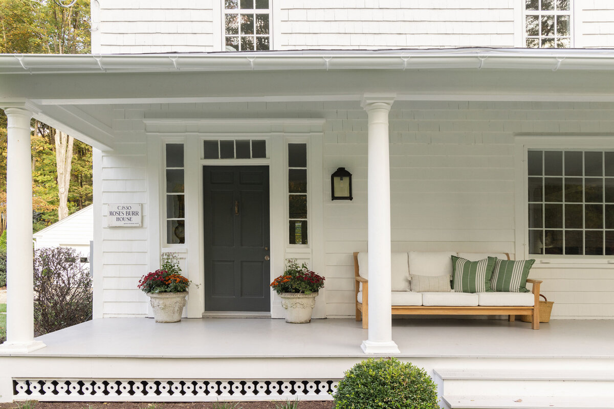The circa 1830 Moses Burr House in Weston had undergone some unsympathetic renovations through the years, yet still retained its original wide plank floors, four fireplaces and a charming front porch. Using a subtle palette of soft greens and other colors found in nature, and with a new kitchen, baths, roof and mechanical systems, we designed a home that sits comfortably in its history while functioning perfectly for today.